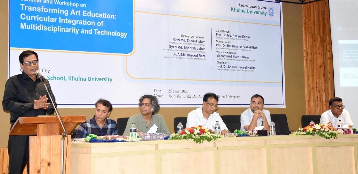 খুলনা বিশ্ববিদ্যালয়ের চারুকলা স্কুলের উদ্যোগে ‘ট্রান্সফরমিং আর্ট এডুকেশন: কারিকুলার ইন্টেগ্রেশন অব মাল্টিডিসিপ্লিনারিটি এন্ড টেকনোলজি’ শীর্ষক এক সেমিনার ও কর্মশালা আজ ২৫ জুন (বুধবার) অনুষ্ঠিত হয়। সকাল ৯.৩০ মিনিটে বিশ্ববিদ্যালয়ের সাংবাদিক লিয়াকত আলী মিলনায়তনে আয়োজিত সেমিনারে প্রধান অতিথি হিসেবে বক্তব্য রাখেন উপ-উপাচার্য প্রফেসর ড. মোঃ হারুনর রশীদ খান।