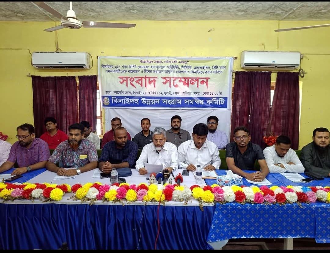 ঝিনাইদহ ২৫০ শয্যা জেনারেল হাসপাতালে আধুনিক চিকিৎসা সেবা চালু এবং চীনের অর্থায়নে প্রস্তাবিত বিশেষায়িত হাসপাতাল দ্রুত স্থাপনের দাবিতে সংবাদ সম্মেলন অনুষ্ঠিত হয়েছে। শনিবার সকালে শহরের ফ্যামিলি জোন রেস্টুরেন্টে ‘ঝিনাইদহ উন্নয়ন সংগ্রাম সমন্বয় কমিটি’র ব্যানারে এই সংবাদ সম্মেলনের আয়োজন করা হয়।