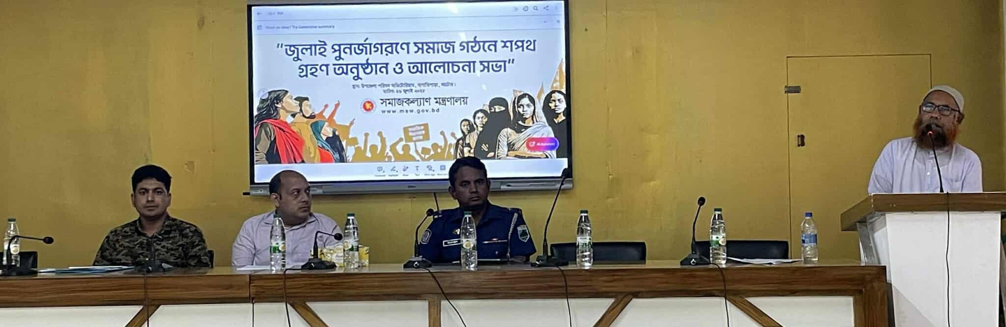 উপজেলা প্রশাসনের আয়োজনে এবং উপজেলা সমাজ সেবা কার্যালয়ের সহযোগিতায় অনুষ্ঠানটি দু’টি পর্বে দেখানো হয়। এরমধ্যে প্রথম পর্বে ভিডিও কনফারেন্সে জুলাই পুনর্জাগরণে সমাজগঠনে লাখো কন্ঠে শপথ পাঠের কেন্দ্রীয় অনুষ্ঠানে সংযুক্ত থাকা এবং দ্বিতীয় পর্বে সমাজগঠনে নারী ও শিশুর সুরক্ষা বিষয়ে আলোচনা সভা অনুষ্ঠিত হয়।