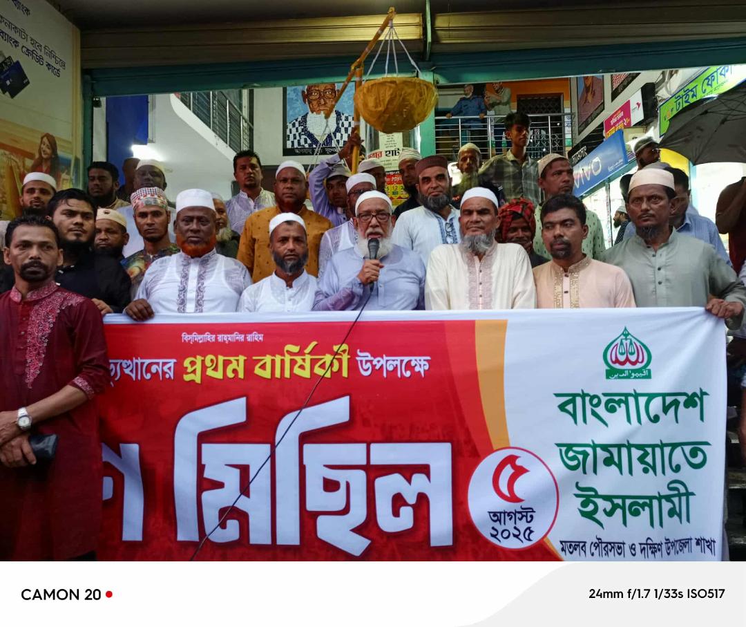 আজ মঙ্গলবার (৫ আগস্ট ২০২৫) বাদ আছর বাংলাদেশ জামায়াতে ইসলামী মতলব দক্ষিণ উপজেলা ও পৌর শাখার আয়োজনে স্থানীয় ম্যাক্সি স্ট্যান্ডে ও রিক্সা স্ট্যান্ডের পথ সভায় প্রধান অতিথির বক্তব্যে তিনি একথাগুলো বলেন। পথসভা শেষে স্থানীয় ম্যাক্সি স্ট্যান্ড থেকে গণ মিছিল শুরু হয়ে মতলবের প্রধান প্রধান সড়ক প্রদক্ষিণ করে এনএএম টাওয়ার সংলগ্ন রিক্সা স্ট্যান্ডে পথসভার মাধ্যমে সমাপ্ত হয়।