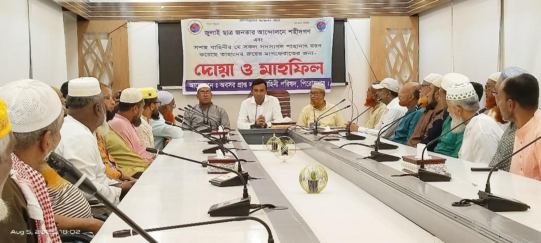 জুলাই মাসে সংঘটিত ঐতিহাসিক ছাত্র-জনতার আন্দোলনে শহীদ এবং দেশের স্বাধীনতা ও নিরাপত্তার জন্য আত্মত্যাগকারী সশস্ত্র বাহিনীর সদস্যদের স্মরণে পিরোজপুরে এক দোয়া মাহফিল অনুষ্ঠিত হয়েছে।