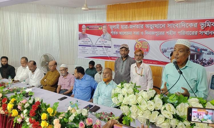 শনিবার (৯ আগস্ট, ২০২৫) দিনাজপুর প্রেসক্লাব মিলনায়তনে ‘ফ্যাসিবাদী দুঃশাসনের অবসানে জুলাই ছাত্র-জনতার অভ্যুত্থানে সাংবাদিকদের ভূমিকা’ শীর্ষক আলোচনা সভা ও দিনাজপুরের শহীদ পরিবারের সম্মাননা অনুষ্ঠানে প্রধান অতিথির বক্তব্যে তিনি এ কথা বলেন।