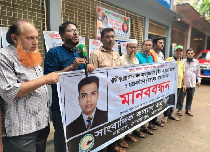 গাজীপুরের সাংবাদিক আসাদুজ্জামান তুহিনকে হত্যার প্রতিবাদ ও হত্যাকারীদের দৃষ্টান্তমূলক শাস্তির দাবীতে তিন উপজেলার সংগঠন “সাংবাদিক কল্যাণ তহবিল” নাচোল, গোমস্তাপুর ও ভোলাহাট-এর আয়োজনে বুধবার (১৪ আগষ্ট ২০২৫) দুপুর ১২টায় গোমস্তাপুর উপজেলা পরিষদ চত্বরে মানববন্ধন অনুষ্ঠিত হয়েছে।