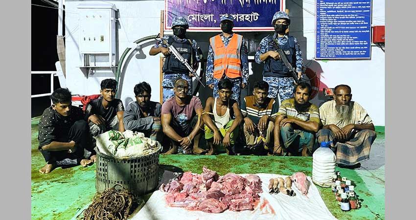 বিশ্ব ঐতিহ্য সুন্দরবনের হারবারিয়ায় কোস্ট গার্ডের অভিযানে ১৩ কেজি হরিণের মাংস ও কাঁকড়াসহ ৮ শিকারী আটক