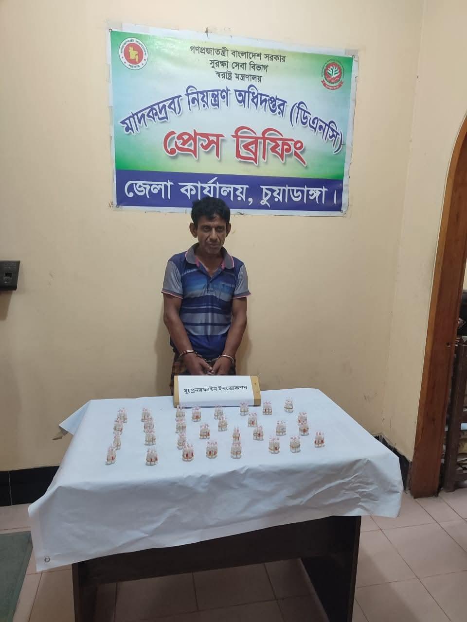 মাদকদ্রব্য নিয়ন্ত্রণ অধিদপ্তর, জেলা কার্যালয়, চুয়াডাঙ্গা কর্তৃক পরিচালিত মাদকবিরোধী অভিযানে ১৫০ (একশত পঞ্চাশ) অ্যাম্পুল বূপ্রেনরফাইন ইনজেকশন সহ ০১ জন মাদক ব্যবসায়ী গ্রেফতার