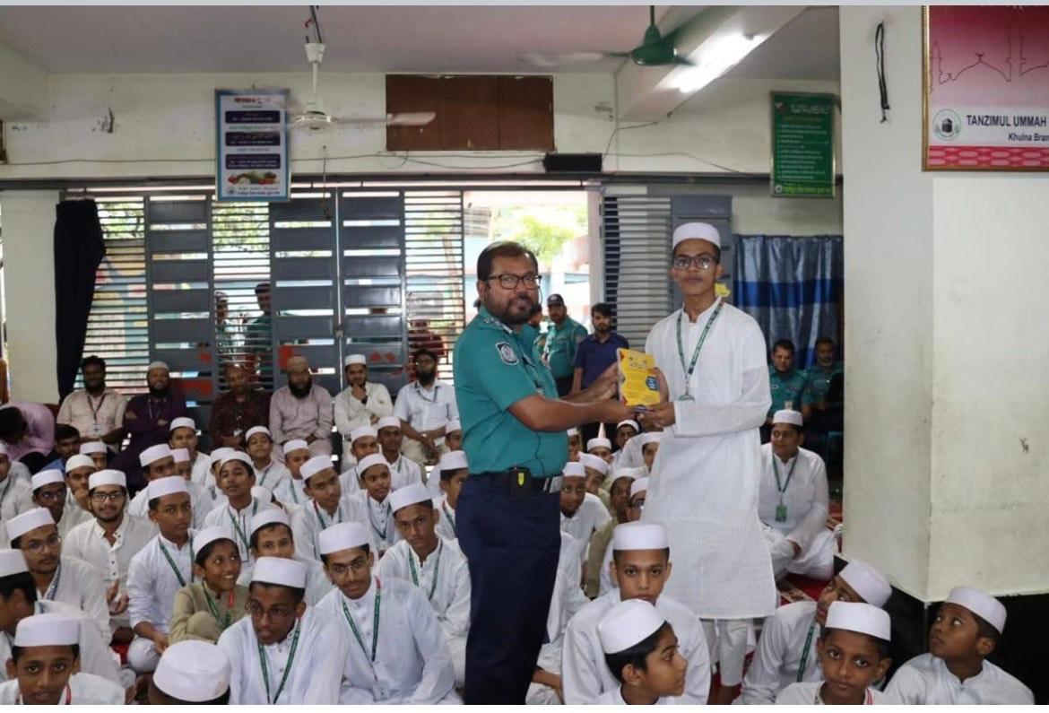 এম এ জলিল বিভাগীয় প্রতিনিধি খুলনা : ছাত্রছাত্রীদের নিরাপদে রাস্তা ব্যবহারের নিয়ম-কানুন সম্পর্কে অবহিত করার জন্য খুলনা মেট্রোপলিটন পুলিশ কমিশনার জনাব মোঃ জুলফিকার আলী হায়দার নগরীর তানযীমুল উম্মাহ প্রি হিফয মাদরাসায় উপস্থিত হয়ে ‘রোড সেফটি’র উপর নির্মিত ভিডিও প্রদর্শন করেন।