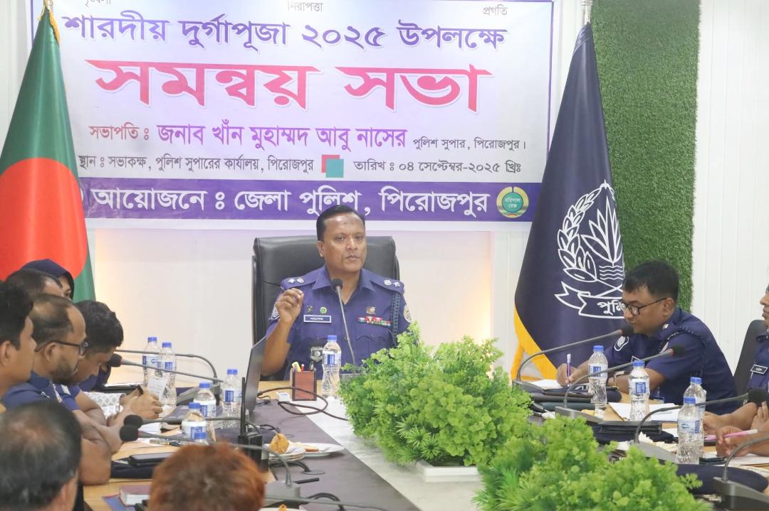 মোঃ মনিরুল ইসলাম চৌধুরী, স্টাফ রিপোর্টারঃ পিরোজপুরে হিন্দু সম্প্রদায়ের সর্ববৃহৎ ধর্মীয় উৎসব শারদীয় দুর্গাপূজা-২০২৫ উদযাপন উপলক্ষে আইন-শৃঙ্খলা পরিস্থিতি স্বাভাবিক রাখার লক্ষ্যে এক সমন্বয় সভা অনুষ্ঠিত হয়েছে। বৃহস্পতিবার (৪ সেপ্টেম্বর) সকালে পুলিশ সুপারের সম্মেলন কক্ষে এ সভা অনুষ্ঠিত হয়। এতে সভাপতিত্ব করেন পুলিশ সুপার খাঁন মুহাম্মদ আবু নাসের।