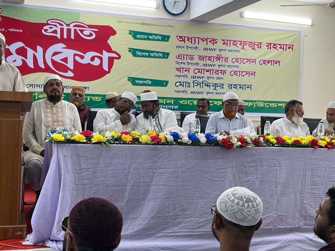 এম এ জলিল বিভাগীয় প্রতিনিধি খুলনা : ৭ সেপ্টেম্বর আল ফারুক সোসাইটিতে বাংলাদেশ জামায়াতি ইসলামী আয়োজিত আই বি ডব্লিউ এফ এর প্রীতি সমাবেশ অনুষ্ঠিত হয় ।দুপুর একটার সময় সমাবেশ অনুষ্ঠিত হয়। উক্ত সমাবেশে প্রধান অতিথি হিসেবে উপস্থিত ছিলেন খুলনা মহানগরী জামাতি ইসলামী আমীর জনাব অধ্যাপক মাহফুজুর রহমান । খুলনা ৩ আসনের সংসদ সদস্য প্রার্থী। বিশেষ অতিথি হিসেবে উপস্থিত ছিলেন জনাব জাহাঙ্গীর আলম হেলাল। সংসদ সদস্য প্রার্থী খুলনা ২ । বিশেষ অতিথি হিসেবে আরো উপস্থিত ছিলেন খান মোশারফ হোসেন অঞ্চল পরিচালক আইডিডব্লিউএফ খুলনা মহানগর। এছাড়া উপস্থিত ছিলেন খুলনা সদর থানা দৌলতপুর থানা হরিণটা না থানা লবণ চোরা থানা ও খালিশপুর থানার সভাপতি সেক্রেটারি এবং সাধারণ সম্পাদক বৃন্দ । প্রীতি সমাবেশ এর পরে প্রতি ভোজ আয়োজন করা হয়। বিকাল পাঁচটায় অনুষ্ঠান সমাপ্ত হয়।