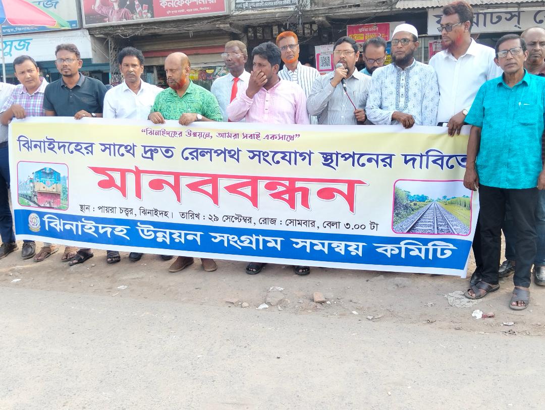 দ্রুত রেলপথ সংযোগ বাস্তবায়নের দাবিতে ঝিনাইদহ উন্নয়ন সংগ্রাম সমন্বয় কমিটির উদ্যোগে রবিবার দুপুরে শহরের পায়রা চত্বরে মানববন্ধন অনুষ্ঠিত হয়েছে। জেলার বিভিন্ন রাজনৈতিক, সামাজিক, সাংস্কৃতিক সংগঠন ও শিক্ষাপ্রতিষ্ঠানের শিক্ষক-শিক্ষার্থীসহ সর্বস্তরের মানুষ এ কর্মসূচিতে অংশ নেন।