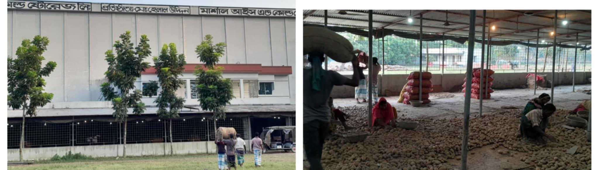 ক্যাপশন: মার্শাল এন্ড মমতা কোল্ড স্টোরেজ। হিমাগারের শেডে আলু বাছাই করছেন কয়েকজন শ্রমিক (বামে)।