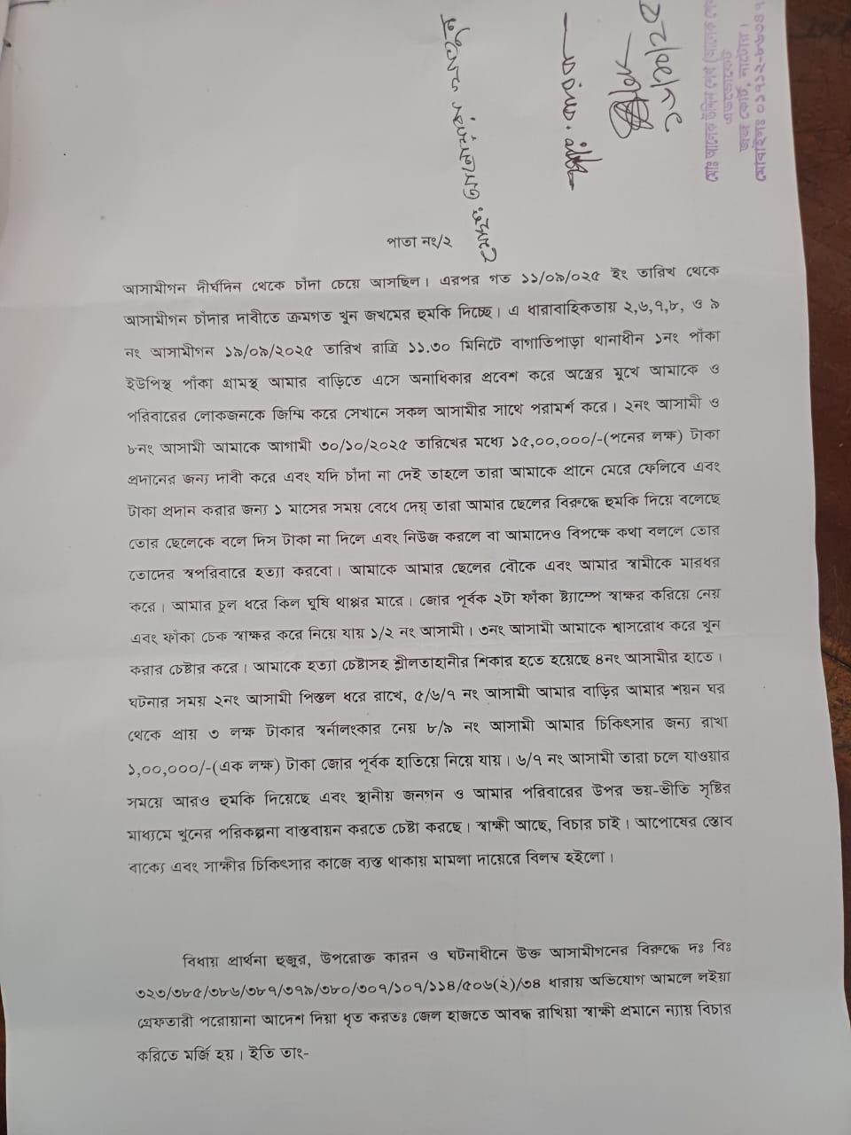 এ সময় আসামিরা বাদীর কাছ থেকে ১৫ লাখ টাকা চাঁদা দাবি করে এবং টাকা না দিলে প্রাণে হত্যার হুমকি দেয়। তারা বাদী, তার স্বামী ও ছেলের স্ত্রীকে মারধর করে এবং জোরপূর্বক দুটি ফাঁকা স্ট্যাম্প ও একটি চেকে স্বাক্ষর নেয় বলে অভিযোগে উল্লেখ করা হয়।