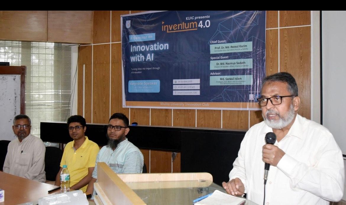 খুলনা বিশ্ববিদ্যালয়ের ইনোভেশন ক্লাব আয়োজিত ‘ইনভেন্টাম ৪.০’ উপলক্ষ্যে ‘ইনোভেশন উইথ এআই’ শীর্ষক সেমিনার অনুষ্ঠিত হয়েছে। আজ ১৮ অক্টোবর (শনিবার) দুপুর ১২টায় বিশ্ববিদ্যালয়ের ১নং একাডেমিক ভবনের কম্পিউটার সায়েন্স এন্ড ইঞ্জিনিয়ারিং ডিসিপ্লিনের স্মার্ট ক্লাসরুমে এ সেমিনার হয়।