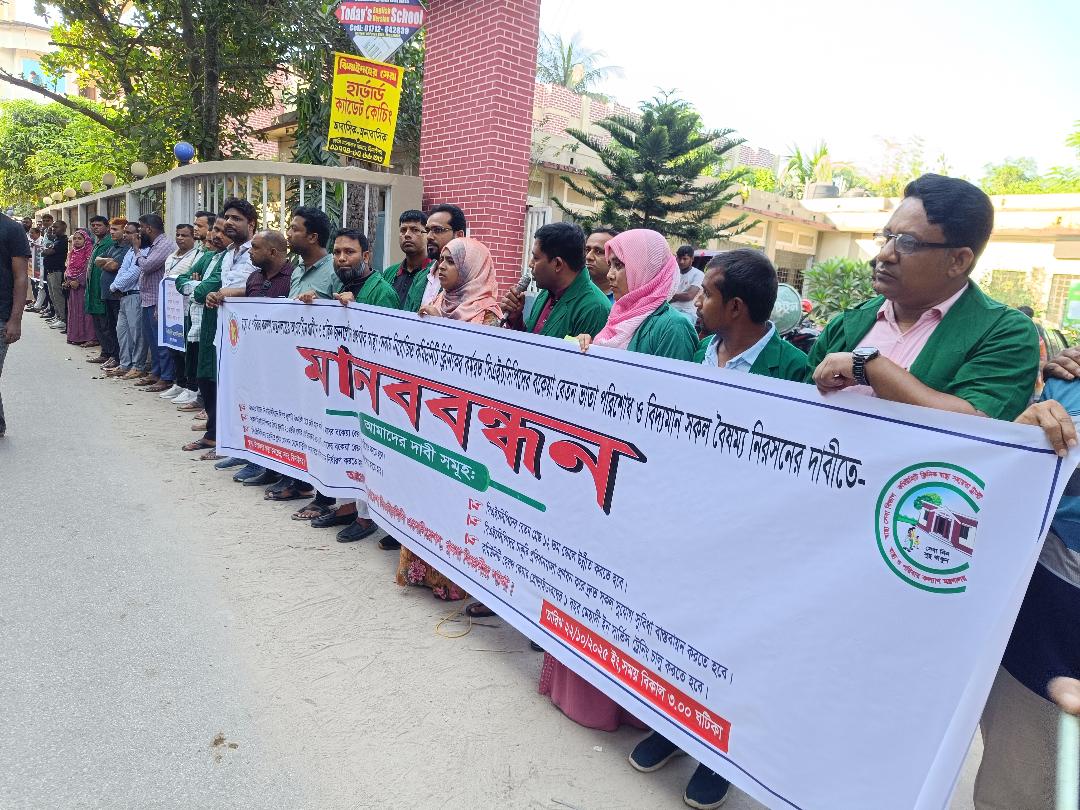বকেয়া বেতন পরিশোধ, ১২তম গ্রেডে উন্নীতকরণ ও চাকরি প্রবিধানমালা প্রণয়নসহ ৮ দফা দাবিতে ঝিনাইদহে মানববন্ধন কর্মসূচি পালন করেছে খুলনা বিভাগের কমিউনিটি হেলথ কেয়ার প্রোভাইডাররা (সিএইচসিপি)।