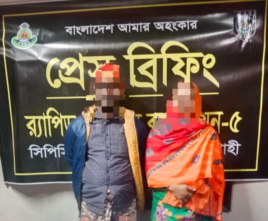 স্বামী-স্ত্রীকে গ্রেফতার করেছে র্যাব-৫, সিপিসি-১ এর একটি আভিযানিক দল। শুক্রবার (২১ নভেম্বর ২০২৫) বিকেল ৫টার দিকে উপজেলার ২নং গোয়ালবাড়ী ইউনিয়নের সুরানপুর (কচিপাইকড়) গ্রামে এ অভিযান পরিচালনা করা হয়। গ্রেফতারকৃতরা হলেন ১) মোছাঃ ময়না (৪০), স্ত্রী-মোঃ রবিউল ইসলাম ২) মোঃ রবিউল ইসলাম (৪২), পিতা-মৃত সহিমুদ্দিন উভয়ের বাড়ি সুরানপুর (কচিপাইকড়), থানা-ভোলাহাট, জেলা চাঁপাইনবাবগঞ্জ। র্যাব জানায়, র্যাপিড অ্যাকশন ব্যাটালিয়ন প্রতিষ্ঠার পর থেকেই তারা আইন-শৃঙ্খলা রক্ষা ও মাদকসহ নানামুখী অপরাধ দমনে অগ্রণী ভূমিকা পালন করে আসছে। এরই ধারাবাহিকতায় সিপিসি-১ চাঁপাইনবাবগঞ্জের একটি আভিযানিক দল ওইদিন জেলার বিভিন্ন এলাকায় টহল ও মাদকবিরোধী অভিযান পরিচালনা করছিল। অভিযান চলাকালে গোপন সংবাদের ভিত্তিতে জানা যায়, সুরানপুর (কচিপাইকড়) গ্রামের একটি বাড়িতে অবৈধ মাদকদ্রব্য ক্রয়-বিক্রয় চলছে। সংবাদ পাওয়ার পর র্যাব সদস্যরা দ্রুত ঘটনাস্থলে পৌঁছে বসতবাড়ির দক্ষিণ দুয়ারী ঘর থেকে স্বামী-স্ত্রীকে গ্রেফতার করে। এসময় তাদের হেফাজত থেকে ১৬৫ গ্রাম হেরোইন উদ্ধার করা হয়। উদ্ধারকৃত মাদক ও গ্রেফতারকৃত দুজনকে পরবর্তী আইনানুগ ব্যবস্থা গ্রহণের জন্য ভোলাহাট থানায় হস্তান্তর করা হয়েছে বলে নিশ্চিত করেছে র্যাব-৫। র্যাব-৫ এর পক্ষ থেকে জানানো হয়, মাদকমুক্ত সমাজ গঠনে তাদের অভিযান অব্যাহত থাকবে।