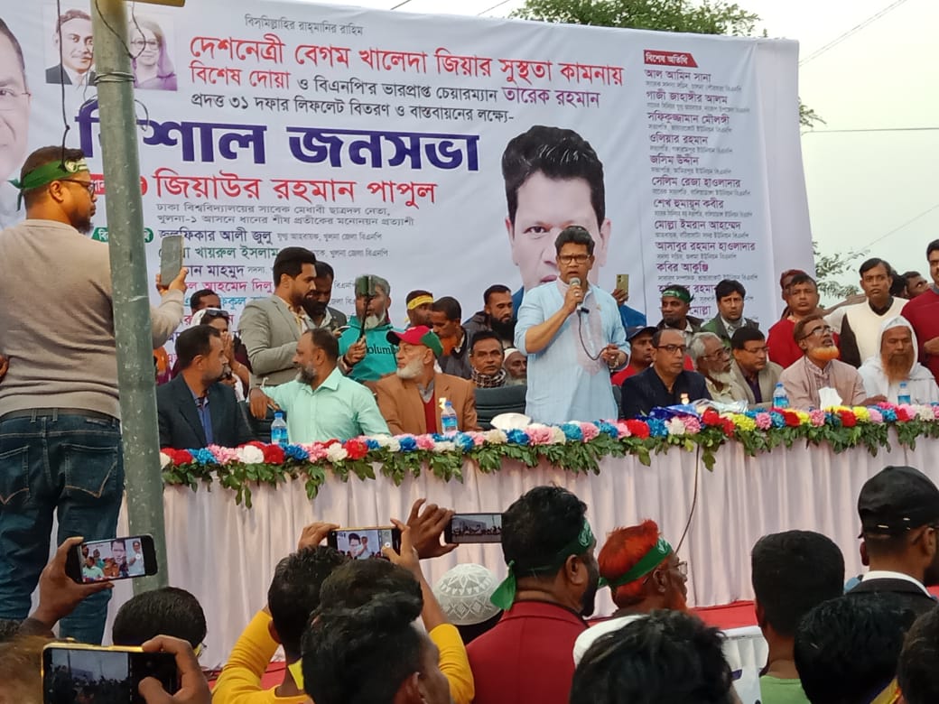 সেখ রাসেল, ব্যুরো চিফ, খুলনা: খুলনা বটিয়াঘাটায় দেশ নেত্রী বিএনপির চেয়ার পার্সন বেগম খালেদা জিয়ার রোগমুক্তি ও সুস্থতা কামনায় এবং বিএনপির ভারপ্রাপ্ত চেয়ারম্যান তারেক রহমান প্রদত্ত ৩১ দফা বাস্তবায়নের লক্ষ্যে নির্বাচনী জনসভা বটিয়াঘাটা উপজেলা বিএনপি’র আহবায়ক এজাজুর রহমান শামীম এর সভাপতিত্বে অনুষ্ঠিত হয়। আজ বিকাল ৩ টায় শুরু হয়ে মাগরিবের আজানের পূর্বে শেষ হয়।