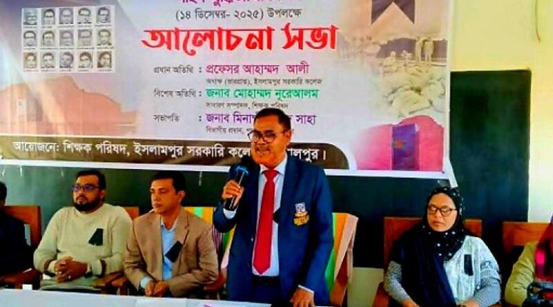 লিয়াকত হোসাইন লায়ন,জামালপুরঃ জামালপুরের ইসলামপুর শহিদ বুদ্ধিজীবী দিবস উপলক্ষে আলোচনা সভা অনুষ্ঠিত হয়েছে। রবিবার (১৪ডিসেম্বর) সরকারী ইসলাসপুর কলেজের উদ্যোগে শিক্ষক