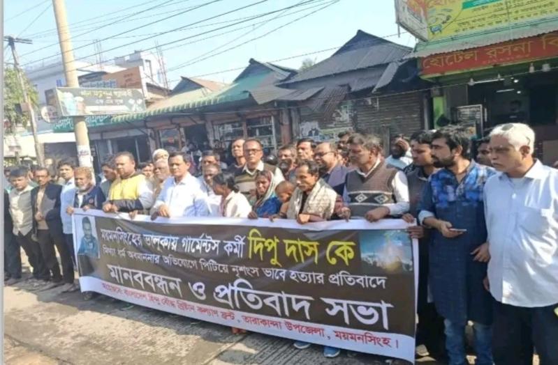 মোঃ হেলাল উদ্দিন সরকার সরকার। স্টাফ রিপোর্টার।তারাকান্দার গার্মেন্টস কর্মী দীপু দাসের খুনিদের ফাঁশির দাবিতে মানববন্ধন ও প্রতিবাদ সভা অনুষ্ঠিত হয়েছে। সোমবার বেলা প্রায় ১১ টায় বাংলাদেশ হিন্দু, বৌদ্ধ, খ্রিস্টান কল্যাণ ফ্রন্ট ও বাংলাদেশ রবিদাস উন্নয়নের উদ্যেগে ময়মনসিংহ শেরপুর মহাসড়কে তারাকান্দা উপজেলা বাসস্ট্যান্ড এলাকা এই মানববন্ধন ও প্রতিবাদ সভা করা হয়। এতে বক্তব্য রাখেন হিন্দু বৌদ্ধ ও খ্রিস্টান ফান্ডের তারাকান্দা উপজেলা আহবায়ক রতন ভৌমিক, সিনিয়র যুগ্ম আহবায়ক চন্দন পন্ডিত, বাংলাদেশ রবিদাস উন্নয়ন পরিষদের উপজেলা শাখার সভাপতি রতন রবিদাস। সাধারণ সম্পাদক সুনীল রবিদাস। প্রকাশ থাকে যে এই খবর বাওয়ার পরিপ্রেক্ষিতে ময়মনসিংহের জেলা প্রশাসক দীপু হত্যার বাড়িতে আসেন এবং তার খোঁজ খবর নেন ও তার পরিবারকে সুষ্ঠু বিচারের আশ্বাস দেন।