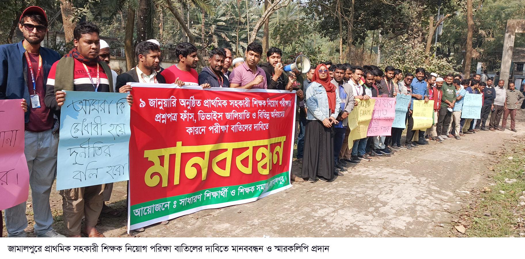 ঘন্টাব্যাপী মানববন্ধনে নিয়োগ পরিক্ষায় অংশগ্রহণকারী উমর ফারুক, সাইদুর রহমান, ইব্রাহীম খলীল, ওমর আল ফারুক, বুলবুল আহমেদ, সোলাইমান, নাজমুল হাসানসহ অন্যান্যরা বক্তব্য রাখেন। এ সময় বক্তারা বলেন, গত ৯ জানুয়ারী দেশব্যাপী প্রাথমিক সহকারী শিক্ষক নিয়োগ পরিক্ষায় অনেকেই ডিভাইসের মাধ্যমে পরিক্ষায় অংশগ্রহণ করেছে এবং অনেকে ধরা পড়েছে। প্রাথমিক শিক্ষা অধিদপ্তর থেকে পরিক্ষা চলাকালীন সময় যেসব নিয়মের কথা বলা হয়েছিলো তা জামালপুরে বিভিন্ন কেন্দ্রে মানা হয়নি। এতে অনেকে ডিভাইস সাথে নিয়ে পরিক্ষায় অংশ নিয়েছে। বিভিন্ন কেন্দ্রে পরীক্ষার্থীরা অন্য পরীক্ষার্থীদের ডিভাইস ব্যবহার করতে দেখে কেন্দ্র কর্তৃপক্ষকে জানালে কেন্দ্র কর্তৃপক্ষ ডিভাইস জালিয়াতিকারীদের নিরাপদে কেন্দ্র থেকে বের করে দেয়। এবং অভিযোগকারীর কাছে ভিডিও প্রমাণ দেখতে চায়। এতো অনিয়মের পরেও প্রাথমিক শিক্ষা অধিদপ্তরের মহাপরিচালক বলেছেন পরিক্ষা নিরপেক্ষ হয়েছে। ৯ জানুয়ারীর পরিক্ষা বাতিল ও সুষ্ঠ তদন্তের মাধ্যমে অনিয়মের সাথে জড়িতদের আইনের আওতায় এনে পুনরায় পরিক্ষা গ্রহণের দাবি জানান বক্তারা। পরে জেলা সহকারি প্রাথমিক শিক্ষা অফিসার মোহাম্মদ হারুন অর রশিদের কাছে মৌখিক ভাবে তাদের দাবী উপস্থাপন করেন এবং জেলা প্রাথমিক শিক্ষা অফিসার মোহাম্মদ আলী আহসানের কাছে স্মারকলিপি প্রদান করেন নিয়োগ পরিক্ষায় অংশগ্রহনকারী পরীক্ষার্থীরা।