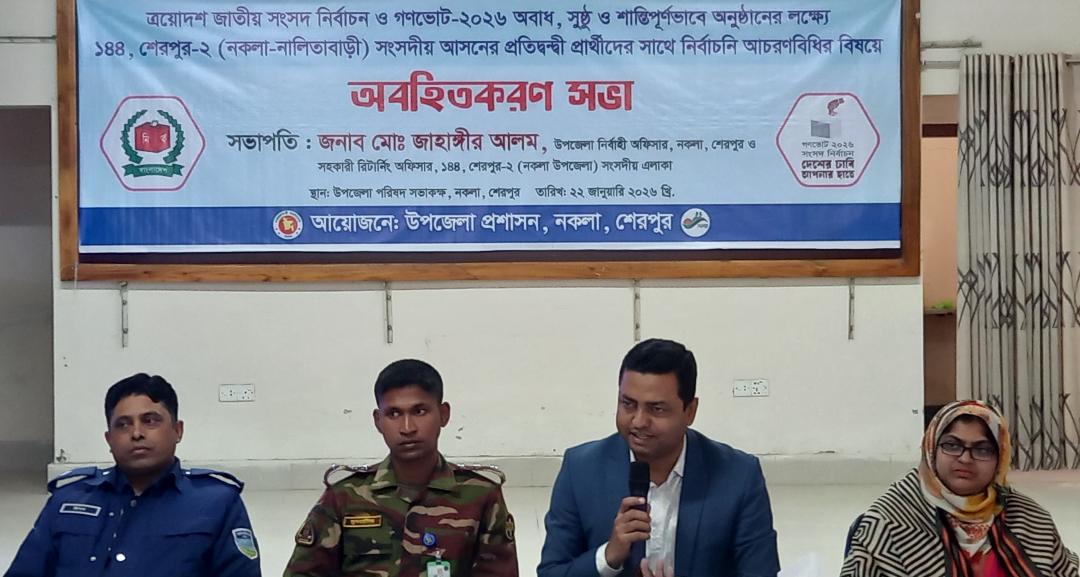 জাহাঙ্গীর হোসেন, শেরপুর : শেরপুরের নকলায় ক্রয়োদশ জাতীয় সংসদ নির্বাচন ও গণভোট-২০২৬ অবাধ, সুষ্ঠু ও শান্তিপূর্ণভাবে অনুষ্ঠানের লক্ষ্যে শেরপুর-২ (নকলা-নালিতাবাড়ী) সংসদীয় আসনের প্রতিদ্বন্দ্বী প্রার্থীদের সাথে নির্বাচনি আচরণবিধি বিষয়ে অবহিতকরণ সভা হয়েছে।