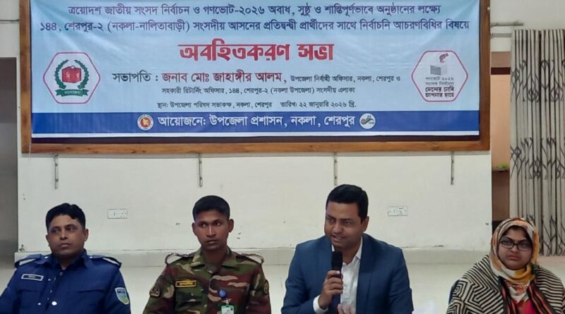 Read moreজাহাঙ্গীর হোসেন, শেরপুর : শেরপুরের নকলায় ক্রয়োদশ জাতীয় সংসদ নির্বাচন ও গণভোট-২০২৬ অবাধ, সুষ্ঠু ও শান্তিপূর্ণভাবে অনুষ্ঠানের লক্ষ্যে শেরপুর-২ (নকলা-নালিতাবাড়ী)