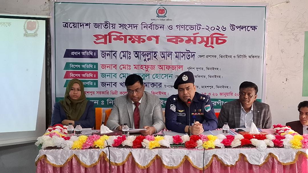 ত্রয়োদশ জাতীয় সংসদ নির্বাচন ও গণভোট উপলক্ষে ঝিনাইদহের মহেশপুরে প্রিজাইডিং কর্মকর্তাদের প্রশিক্ষণ কর্মশালা অনুষ্ঠিত হয়েছে। দিনব্যাপী এ প্রশিক্ষণে মহেশপুর উপজেলার ১২০ জন প্রিজাইডিং কর্মকর্তাকে ভোটগ্রহণের দিন দায়িত্ব পালন, আইনশৃঙ্খলা রক্ষা, ব্যালট ব্যবস্থাপনা ও নির্বাচন সংক্রান্ত বিধি-বিধান সম্পর্কে বিস্তারিত প্রশিক্ষণ প্রদান করা হয়।