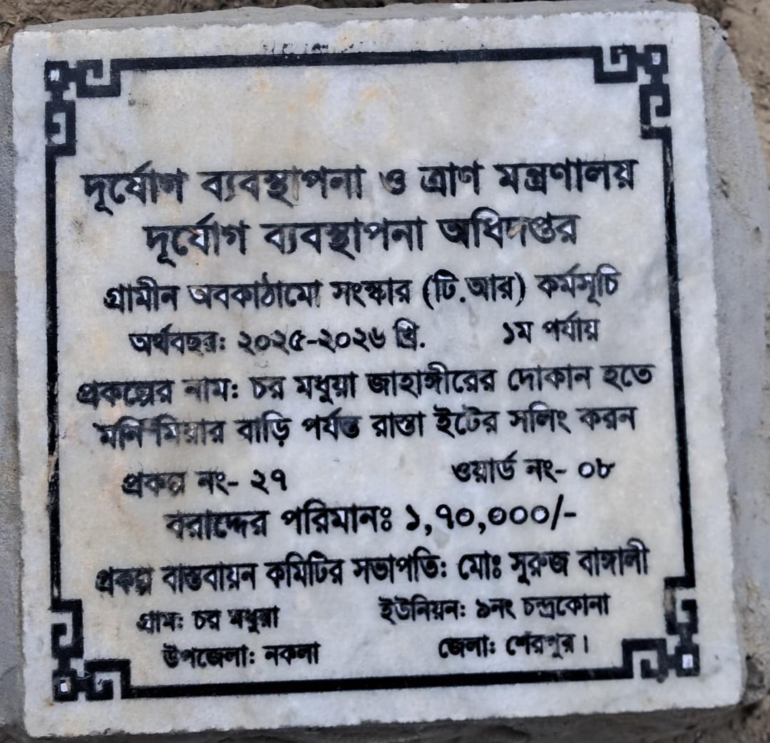 দুর্যোগ ব্যবস্থাপনা, ত্রাণ মন্ত্রণালয়, দুর্যোগ ব্যবস্থাপনা অধিদপ্তর টিআর এর গ্রামীণ অবকাঠামো সংস্কার কর্মসূচীর অধীনে ২০২৫-২০২৬ অর্থবছরের ১ম পর্যায়ে চরমধুয়া জাহাঙ্গীরের দোকান হইতে মনি মিয়ার বাড়ি পর্যন্ত ইটের সলিং করার কথা নামকরণ প্লেটে উল্লেখ করা হয়েছে।