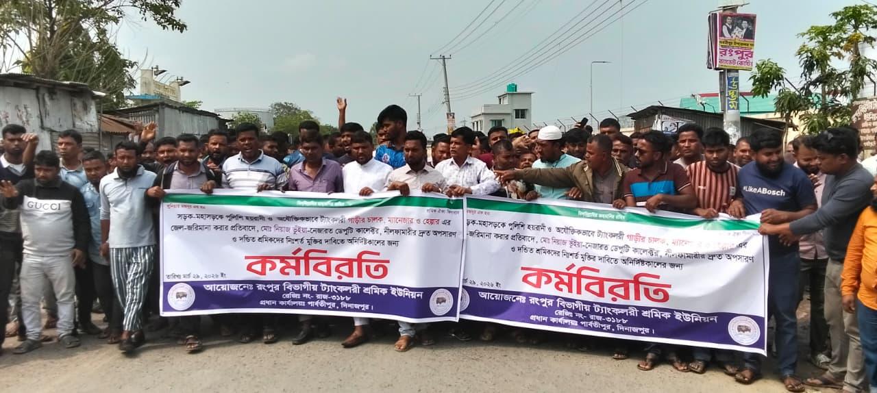 জ্বালানি তেল পরিবহনের কাজে নিয়োজিত ট্যাংকলরীর চালকসহ তিন শ্রমিককে ভ্রাম্যমাণ আদালতের কারাদণ্ড ও জরিমানার প্রতিবাদে রংপুর বিভাগীয় ট্যাংকলরী শ্রমিক ইউনিয়ন অনির্দিষ্টকালের কর্মবিরতি শুরু করেছে। শ্রমিকদের মুক্তির দাবিতে এই কর্মসূচির ফলে রংপুর বিভাগের ৮ জেলায় জ্বালানি তেল সরবরাহ বন্ধ হয়ে গেছে।