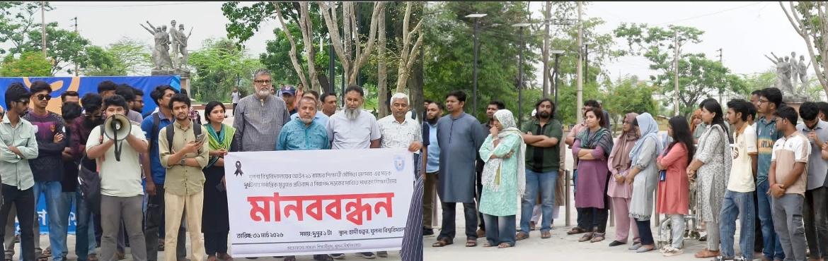 সড়ক দুর্ঘটনায় খুলনা বিশ্ববিদ্যালয়ের আইন ডিসিপ্লিনের মাস্টার্সের শিক্ষার্থী মৌমিতা হালদারের মৃত্যুর প্রতিবাদে সাধারণ শিক্ষার্থীদের উদ্যোগে মানববন্ধন কর্মসূচি পালিত হয়েছে। আজ ৩১ মার্চ (মঙ্গলবার) দুপুর ১টায় বিশ্ববিদ্যালয়ের হাদী চত্বরে এ কর্মসূচি অনুষ্ঠিত হয়।