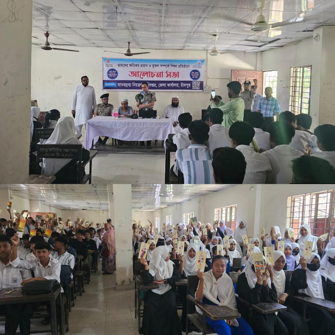 অদ্য ০৭ এপ্রিল ২০২৬ তারিখে চিতোষী রহমত আলী এন্ড মোহাম্মদ আলী উচ্চ বিদ্যালয় প্রাঙ্গণে মাদকদ্রব্য নিয়ন্ত্রণ অধিদপ্তর, জেলা কার্যালয়, চাঁদপুর-এর উদ্যোগে এ মাদকবিরোধী আলোচনা সভা অনুষ্ঠিত হয়।