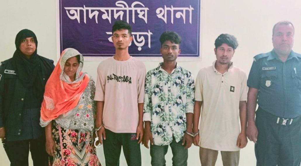 গ্রেপ্তারকৃতরা হলেন- সান্তাহার পোস্ট অফিস পাড়ার নুর ইসলাম বাবুর ছেলে সাহেদুল ইসলাম সাহেদ (২১), শেখ আব্দুল বারেকের মেয়ে রুনা বেগম (৪৫), সান্তাহার পূর্ব লোকো কলোনীর তহিদুল ইসলামের ছেলে মিঠু হোসেন (২৭) ও একই এলাকার আইয়ুব আলীর ছেলে হৃদয় হোসেন (২০)। পুলিশ অপর এক আসামির গ্রেপ্তারে অভিযান চালাচ্ছে।